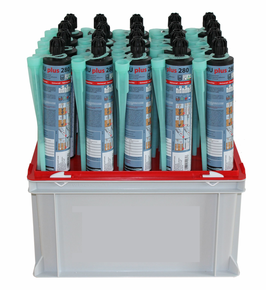 Die praktischen Stapelboxen sind vorgefüllt mit 20 Kartuschen à 280 ml VMU plus 280 Injektionsmörtel.