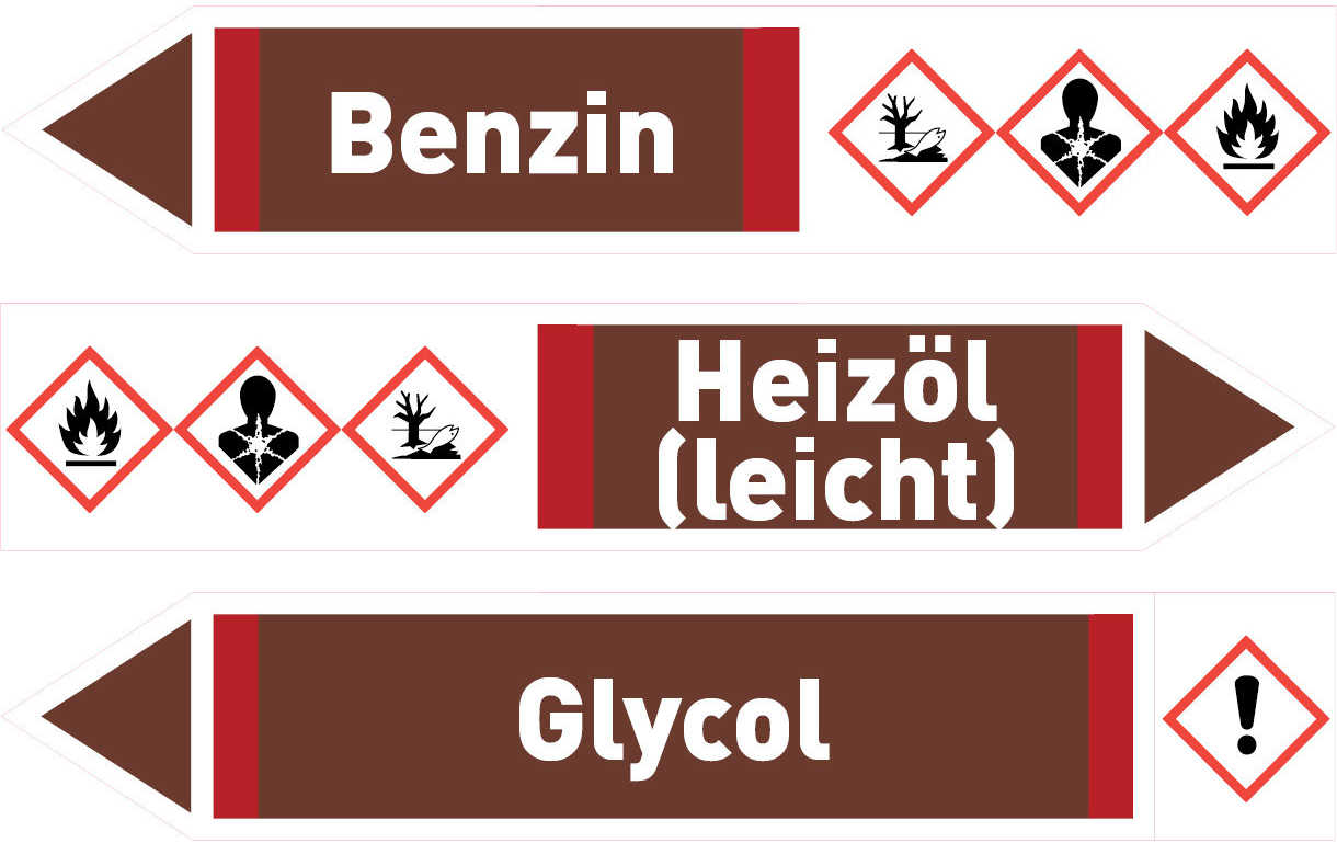 Der dama-tec Fließrichtungspfeil Benzin (braun/weiß/rot) in 125 x 25 mm mit Pfeilrichtung links wird bei Installationsarbeiten eingesetzt und dient zur Kennzeichnung von Medienleitungen. Zur Warnung vor möglichen Gefahren sind CLP/GHS-Gefahrensymbole aufgedruckt. Die Fließrichtungspfeile bestehen aus einer hochwertigen, selbstklebenden PVC-Folie und verfügen über eine Temperaturbeständigkeit von -30°C bis +80°C. Die Verarbeitungstemperatur sollte bei mindestens +10°C liegen.