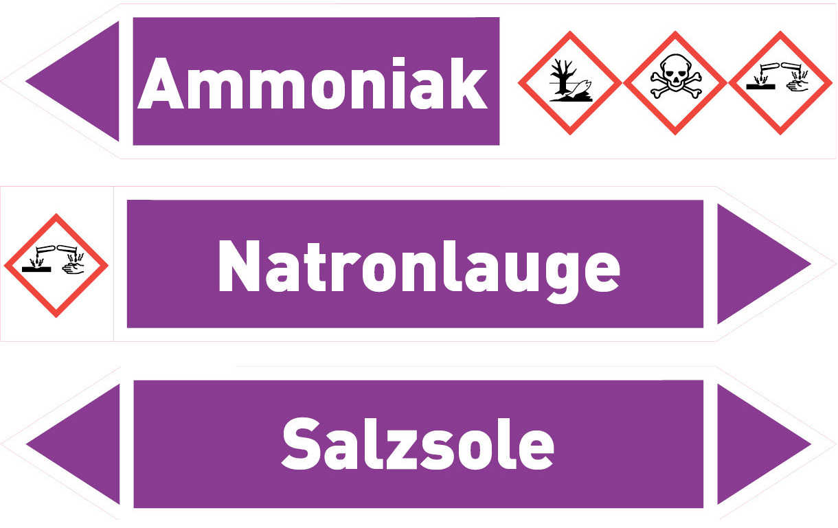 Der dama-tec Fließrichtungspfeil Ammoniak (violett/weiß) in 125 x 25 mm mit Pfeilrichtung links wird bei Installationsarbeiten eingesetzt und dient zur Kennzeichnung von Medienleitungen. Zur Warnung vor möglichen Gefahren sind CLP/GHS-Gefahrensymbole aufgedruckt. Die Fließrichtungspfeile bestehen aus einer hochwertigen, selbstklebenden PVC-Folie und verfügen über eine Temperaturbeständigkeit von -30°C bis +80°C. Die Verarbeitungstemperatur sollte bei mindestens +10°C liegen.