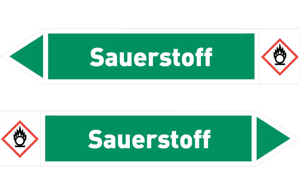 Selbstklebende, witterungsbeständige Kennzeichnungspfeile für Sauerstoffleitungen in verschiedenen Text-/Farbkombinationen. Auf Wunsch produzieren wir gerne auch nach Ihren individuellen Vorgaben.