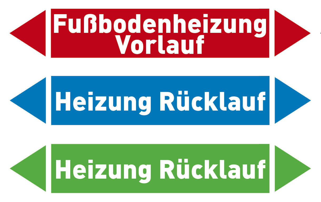 Selbstklebende, witterungsbeständige Kennzeichnungspfeile 215x40 mm für Heizungsleitungen in verschiedenen Text-/Farbkombinationen. Auf Wunsch produzieren wir gerne auch individuell nach Ihren Vorgaben.