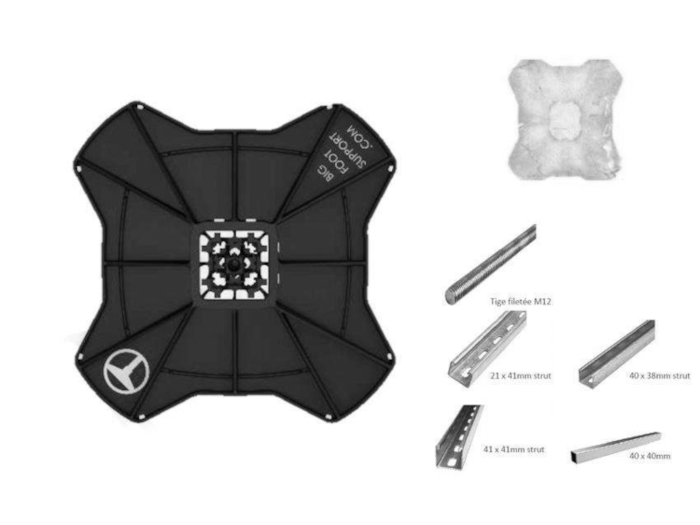 Das Big Foot Set 330 (von Big Foot Systems) bietet eine wirtschaftliche Lösung zur Abstützung von Luftkanälen, Rohren, Spirorohren, Wickelfalzrohren und anderem auf Flachdächern. Die Bigfoot Füße sind mit angeklebter Gummimatte ausgestattet. Diese sorgt für einen zusätzlichen Schutz der Dachhaut. Die Big Foot Füße können mit zahlreichen Montageschienen kombiniert werden, beispielsweise 41/21, 41/41 oder 38/40 mm. Die Schienen gehören nicht zum Standardlieferumfang der Big Foot Sets können aber separat erworben werden. Eine Übersicht über die erhältlichen Montageschienen finden Sie hier. Das Bigfoot Montagesystem eignet sich für zahlreiche Aufständerungen auf Flachdächern und zeichnet sich durch eine sehr kurze Montagezeit aus.